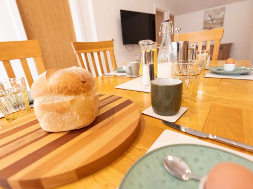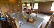 In the living area, there’s an eight-seater dining table and chairs, comfortable sofa and lounge chairs, and a wood-burning stove. The kitchen contains a fridge, integrated two-stove hob, sink, cooking equipment, crockery, and cutlery. Bathroom facilities include an electric shower, washbasin, and flush toilet.