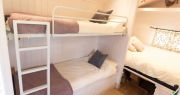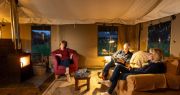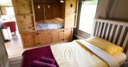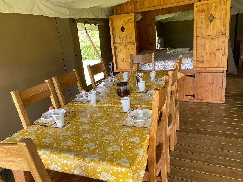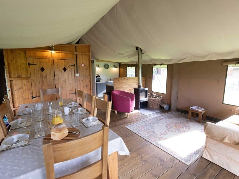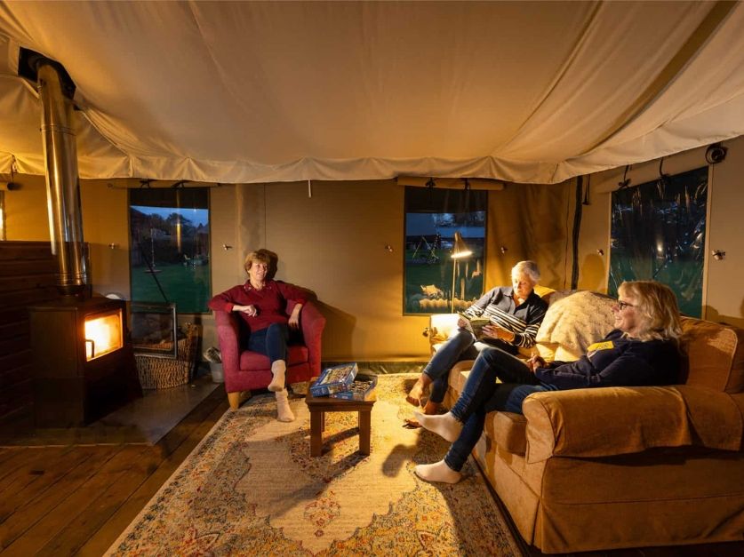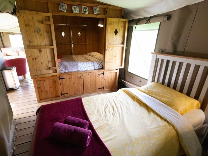 With a double bed in the master bedroom, twin single beds in the second bedroom, a double cabin bed, and a sofa bed in the living area, each safari tent sleeps up to eight people.